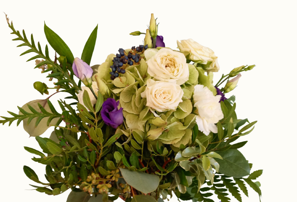 A stunning bouquet of delicate white and green flowers made up of hydrangeas, roses and eucalyptus. Suitable for home decoration for family occasions and as a gift for a boss, colleague or friend. The picture shows a medium size.