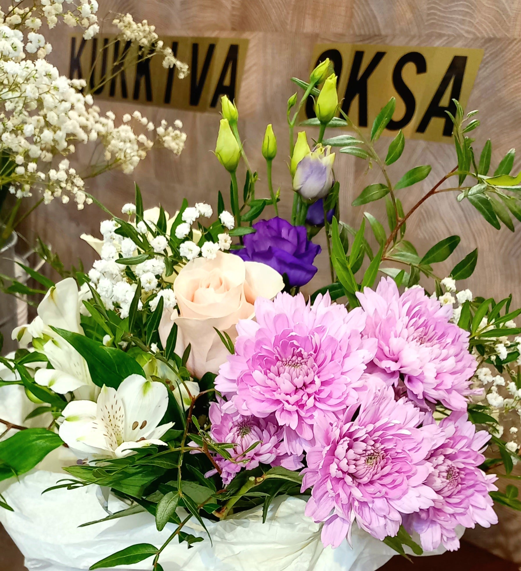 Talvinen viikonloppukimppu, joka symboloi hellyyttä ja lämpöä vaaleanpunaisissa sävyissä sekä viisauden ja jalouden hienostuneita violetin vivahteita. Tämä harmoninen kukkakimppu tuo valoa talvipäiviin, piristää mieltä ja ilahduttaa saajaansa.