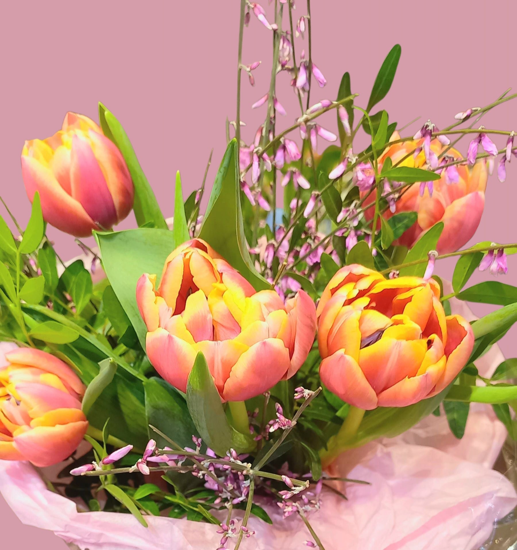 Keväinen herkkä tulppaanien ja vihreiden lehtien kimppu on loistava lahja!