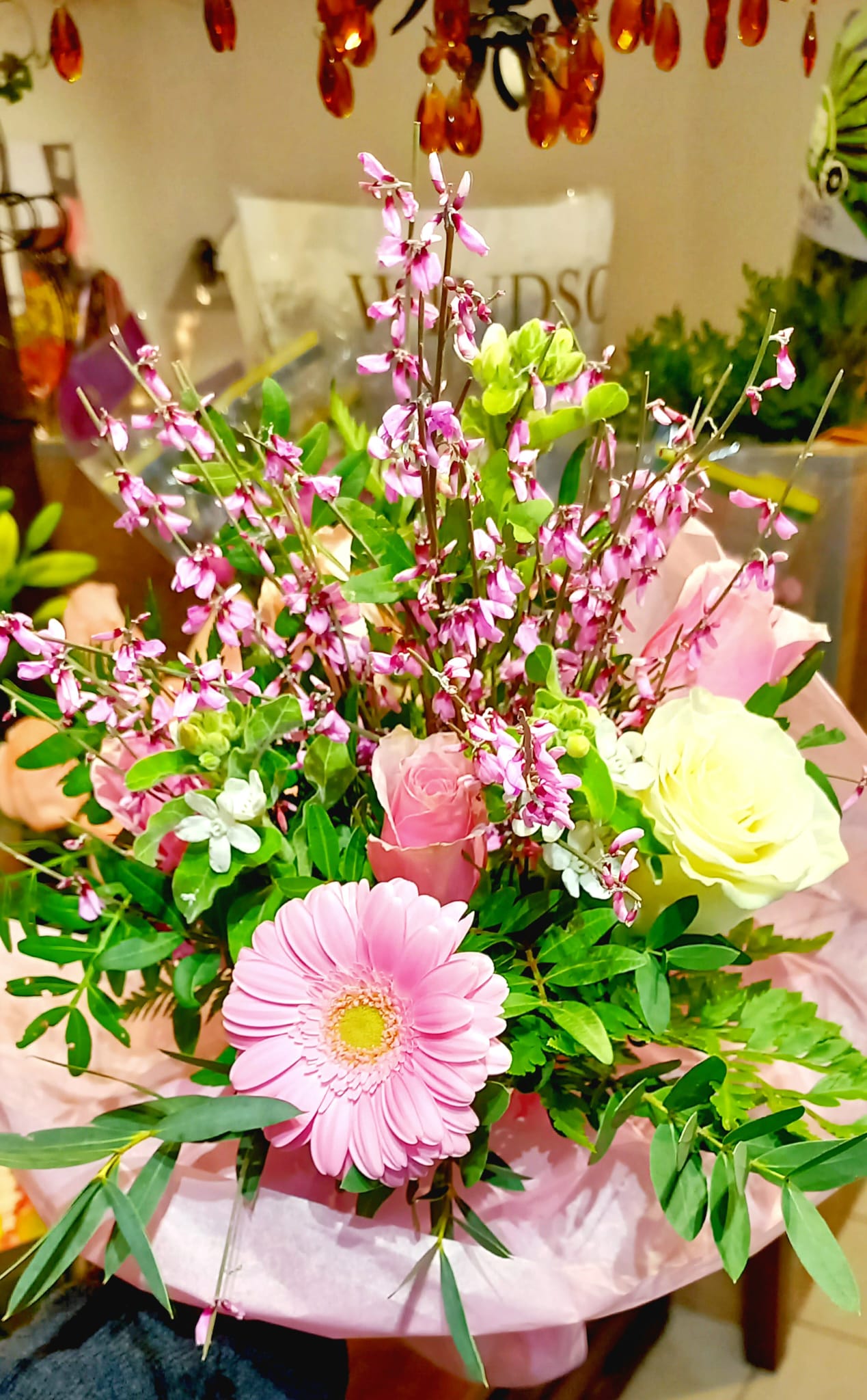Hellä ja raikas kukkakimppu, jossa vaaleanpunaiset sävyt, keväiset oksat ja runsas vihreys luovat kevyen ja iloisen kokonaisuuden. Kimppu huokuu lämpöä, luonnollisuutta ja hienovaraista eleganssia.